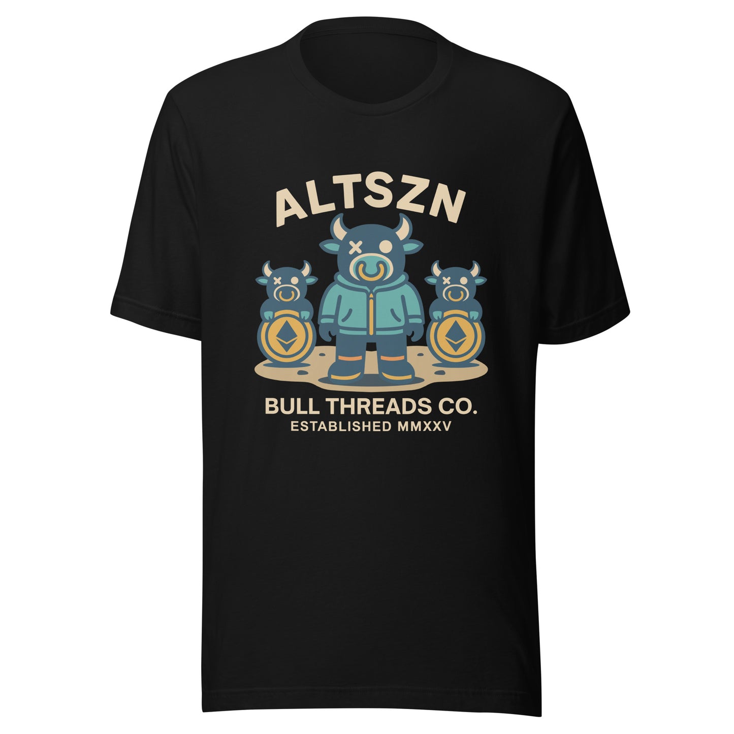 Season of the alts. The ALTSZN | ETH shirt highlights Ethereum’s place at the front of the charge, with the Bull Threads Co. mascot standing tall and flanked by ETH logos. It’s a bold, playful nod to the moments when altcoins take the spotlight and the market energy shifts into overdrive.